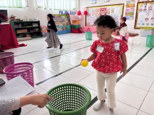 BERANI BERKOMPETISI: Anak-anak kelompok bermain dari beberapa wilayah Kota Semarang sedang mengikuti penyisihan lomba memasukkan bola ke keranjang di KB-TK Nasima.
