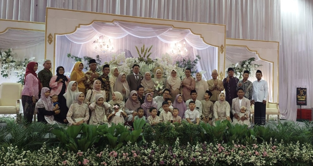 SEMUA BERBAHAGIA: Keluarga besar Dr H Agus Fathuddin Yusuf MA berfoto dengan pasangan Muhammad Muiz Amrolloh dan Astrid Dewinta Adiatisna yang mengadakan resepsi pernikahan di Aula Kaimana Sekolah Nasima pada Ahad 8/2/2026.