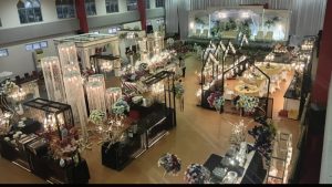 MEGAH DAN ELEGAN: Pelaminan dan area saji boga didekorasi secara artistik di Aula Kaimana yang lapang dan nyaman.