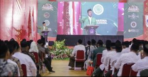 ACARA NASIONAL: Menteri ATR/BPN Republik Indonesia, KH Nusron Wahid sedang berpidato di hadapan ratusan hadirin acara yang diselenggarakan oleh Majelis Ulama Indonesia bersama Badan Pertanahan di Aula Kaimana Sekolah Nasima (3/5/2025)
