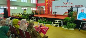 MOMEN STRATEGIS: Ketua Pengurus YPI Nasima, Dr Indarti MPd (berdiri di podium) mengajak semua warga Nasima untuk menjadikan momen halalbihalal sebagai momen untuk memperkuat komitmen dan sinergi mewujudkan target-target lembaga.