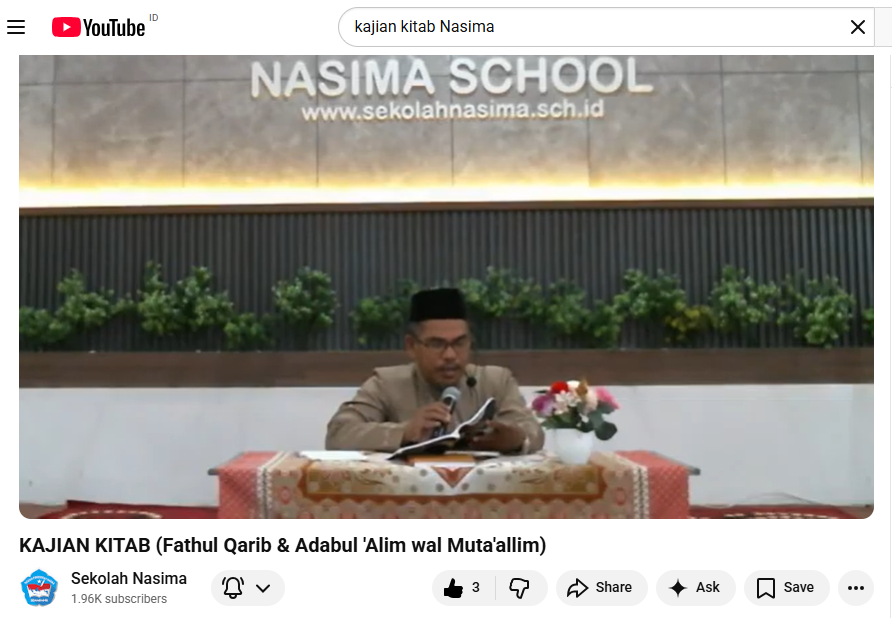 KASIH SAYANG DALAM PEMBELAJARAN: Pengasuh Ponpes Tahfidz Anak “Darul Ilmi” sekaligus anggota tim keagamaan YPI Nasima, Kyai Muhammad Amin MPd AH tampak di layar Youtube Sekolah Nasima sedang mengupas Kitab Adabul Alim Wa Muta’alim (Sabtu 18/4/2026).