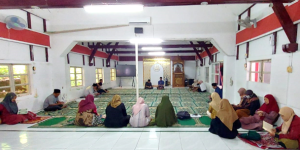 KHIDMAT MENYIMAK: Para guru dan tenaga kependidikan SMP Nasima menyimak pelafalan Al Qur’an secara khidmat di Masjid Baitul Alim.