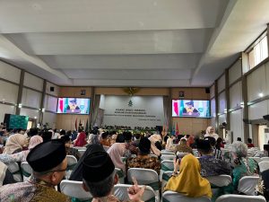 ORASI ILMIAH: Pengawas YPI Nasima yang merupakan Dosen Ilmu Komunikasi UIN Walisongo, Prof Dr H Najahan Musyafak MA CAH (tampak di layar) sedang menyampaikan orasi ilmiah di hadapan hadirin acara pengukuhan 10 guru besar baru.